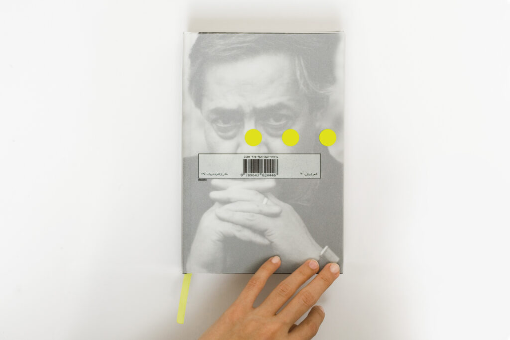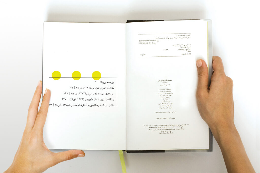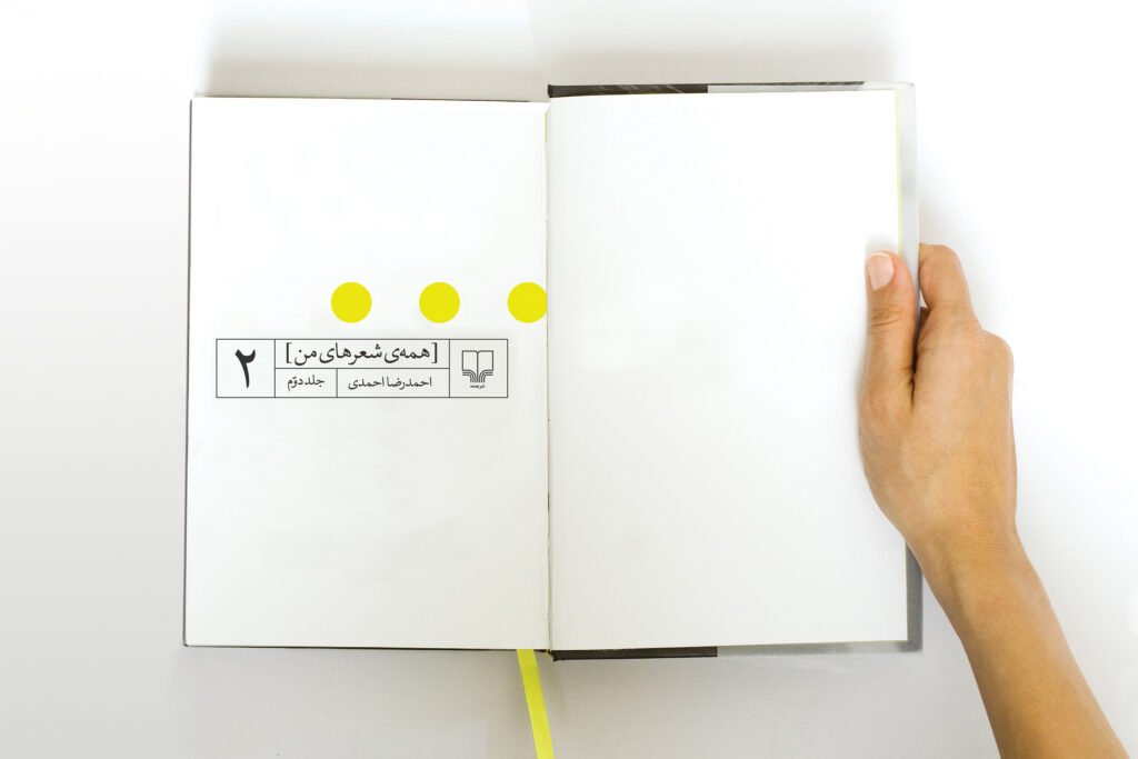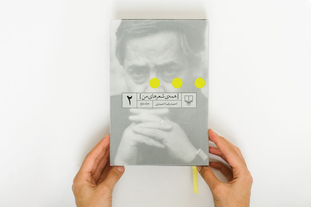 The design of the three-volume collection All My Poems, published by Cheshmeh Publishing, is based on visual concepts related to Ahmadi’s modern poetry. The use of punctuation marks in the design refers to the poet’s distinctive style. The green-yellow color scheme, applied both on the cover and as dividers inside the book, enhances the coherence and visual identity of the collection. On the cover, the poet’s image is featured in three stages of life—youth, middle age, and old age—under a sheet of tracing paper, symbolizing the passage of time and the evolution of his poetry. The collection is housed in a frame that holds all three volumes together, completing its unified visual identity.